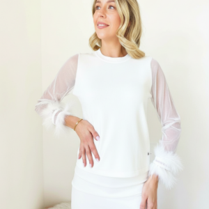 La maglia elegante con maniche in tulle trasparente e polsini in eco-pelliccia è pensata per chi ama distinguersi con discrezione, giocando sui dettagli giusti. Il corpo della maglia è pulito, lineare, facile da abbinare. Le maniche, invece, sono il vero colpo di scena.
