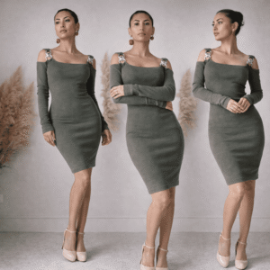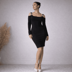Il design con spalle scoperte dona femminilità ed equilibrio, mentre i dettagli gioiello sulle spalline aggiungono carattere e raffinatezza, trasformando un abito apparentemente semplice in un capo che si fa notare.
