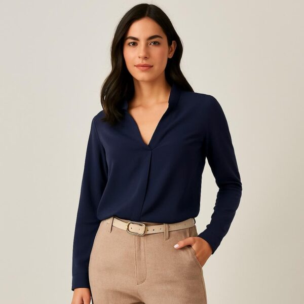 Realizzata in tessuto leggero e confortevole, questa blusa accompagna i movimenti con naturalezza senza stringere né segnare, perfetta per chi desidera sentirsi libera e raffinata allo stesso tempo. La scollatura a V con collo alla coreana dona un tocco moderno e slancia la figura, mentre le maniche lunghe con polsino abbottonato aggiungono quella nota elegante che rende il capo adatto sia al lavoro che al tempo libero.