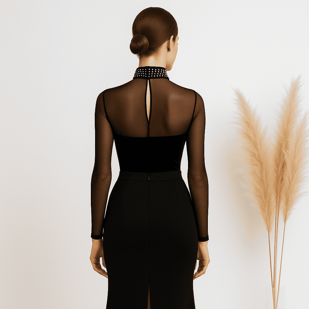 Le maniche in tulle trasparente svelano appena la pelle, giocando tra eleganza e mistero, mentre il collo alto tempestato di micro strass illumina il viso e attira lo sguardo con un fascino ipnotico.