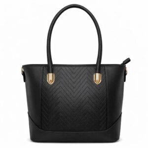 Realizzata in materiale effetto pelle di alta qualità, presenta una texture elegante con motivo geometrico sul fronte che aggiunge carattere senza appesantire lo stile. I manici rigidi garantiscono una presa comoda e una portabilità impeccabile, mentre i dettagli metallici dorati donano luce e un tocco chic anche agli outfit più minimal.