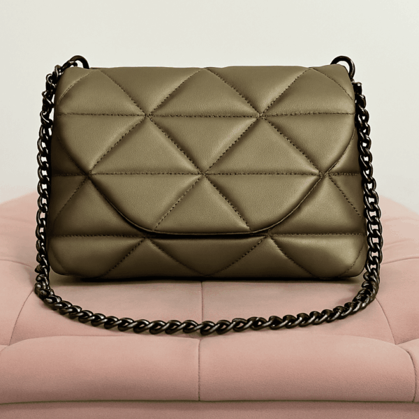 C’è un dettaglio capace di trasformare ogni look in un’emozione: la borsa trapuntata color bronzo con catena.