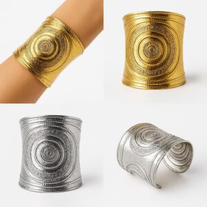 Bracciale rigido effetto Mandala, disponibile in finitura oro o argento. Leggero, luminoso, d’impatto. Un accessorio potente che trasforma ogni outfit.