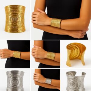 Il design circolare in rilievo cattura la luce e valorizza il braccio e la mano, creando un effetto visivo raffinato e magnetico.