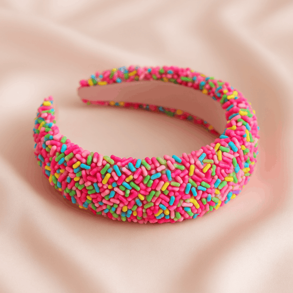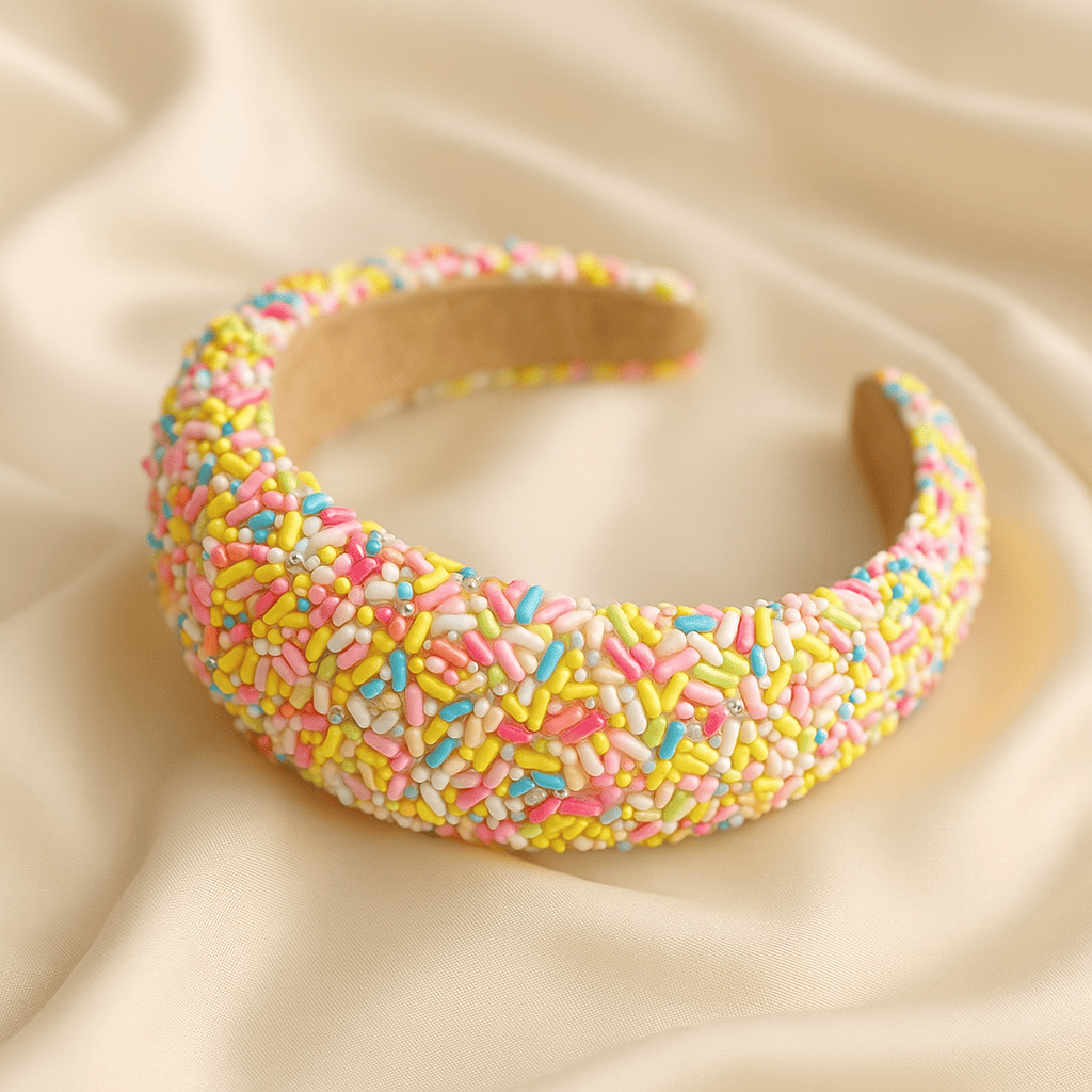 Realizzato con micro perline tridimensionali multicolor effetto zuccherini, questo cerchietto sembra uscito da una fiaba moderna: allegro, chic e incredibilmente glamour. Le perline, applicate una ad una su una base morbida e confortevole, creano una texture unica che regala volume, brillantezza e un tocco di dolcezza irresistibile.
