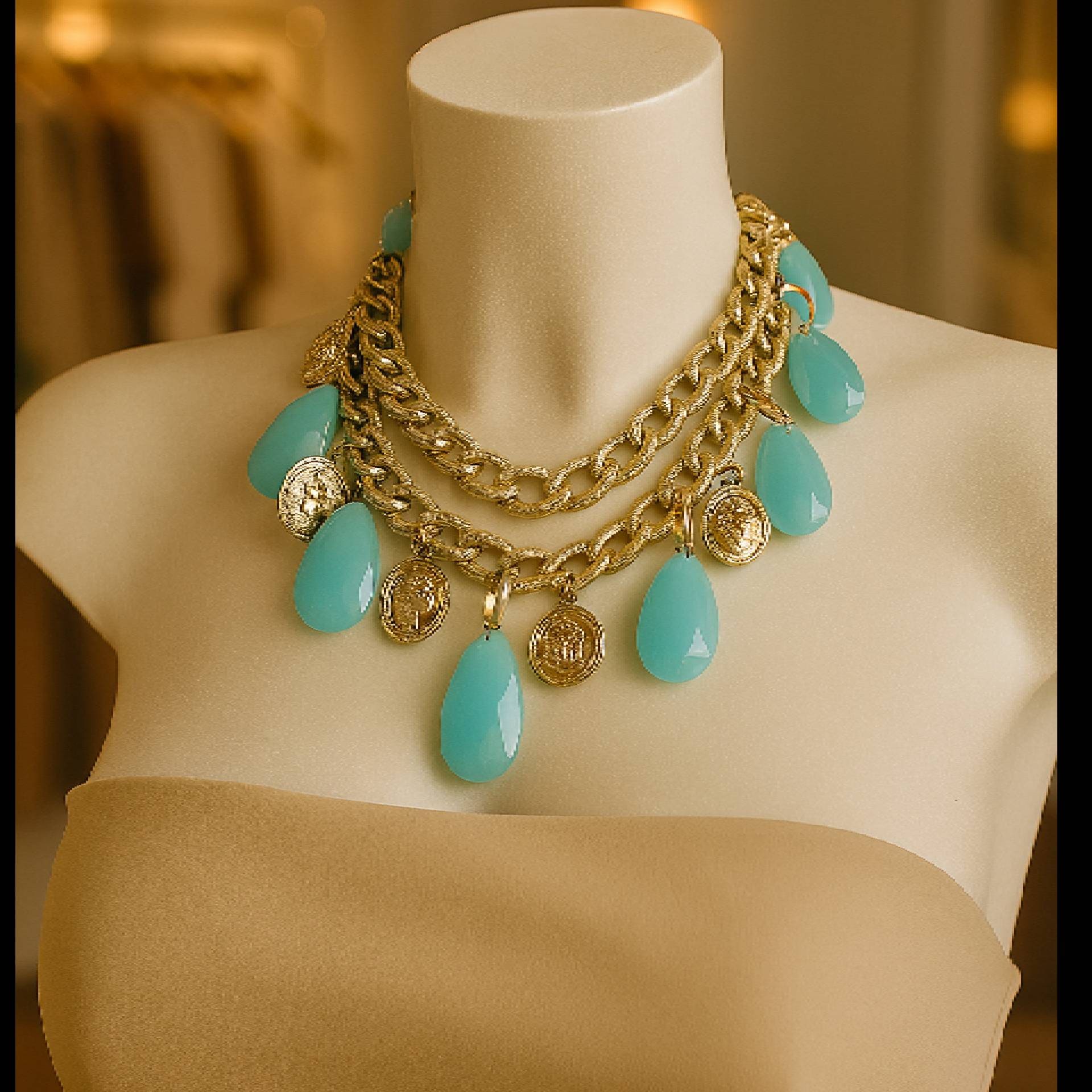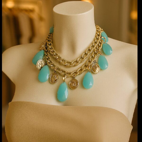 Scopri la collana statement dorata con pendenti turchesi e monete vintage, un gioiello che non passa inosservato e che porta con sé tutta la forza dell’eleganza senza tempo. Realizzata con una catena dorata a maglie importanti, questa collana è arricchita da pendenti color turchese effetto pietra e da monete dorate incise che ricordano antiche icone di stile.