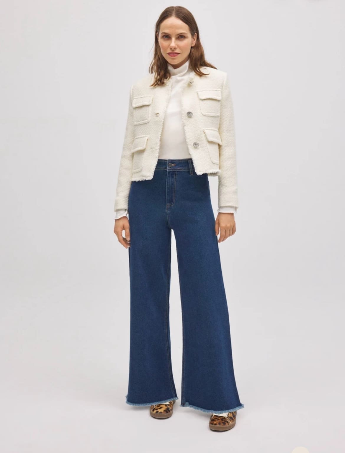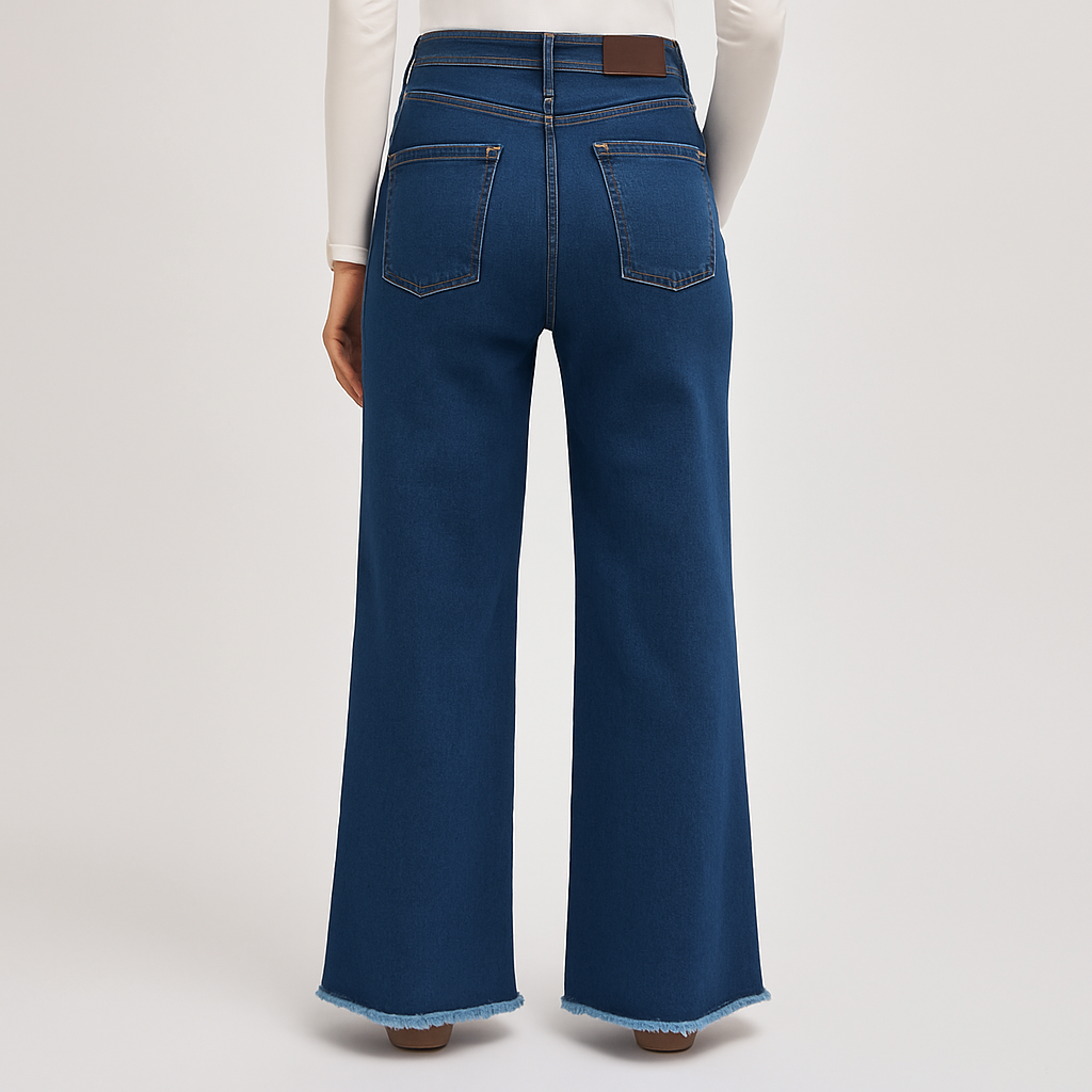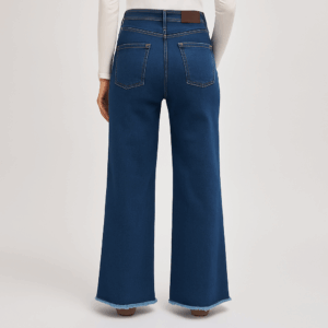 I jeans a gamba larga sono il modello ideale per chi vuole un look moderno, comodo e valorizzante. Vita alta, orlo sfrangiato e denim morbido che slancia la figura.