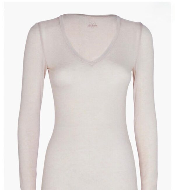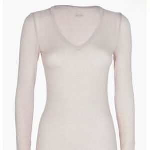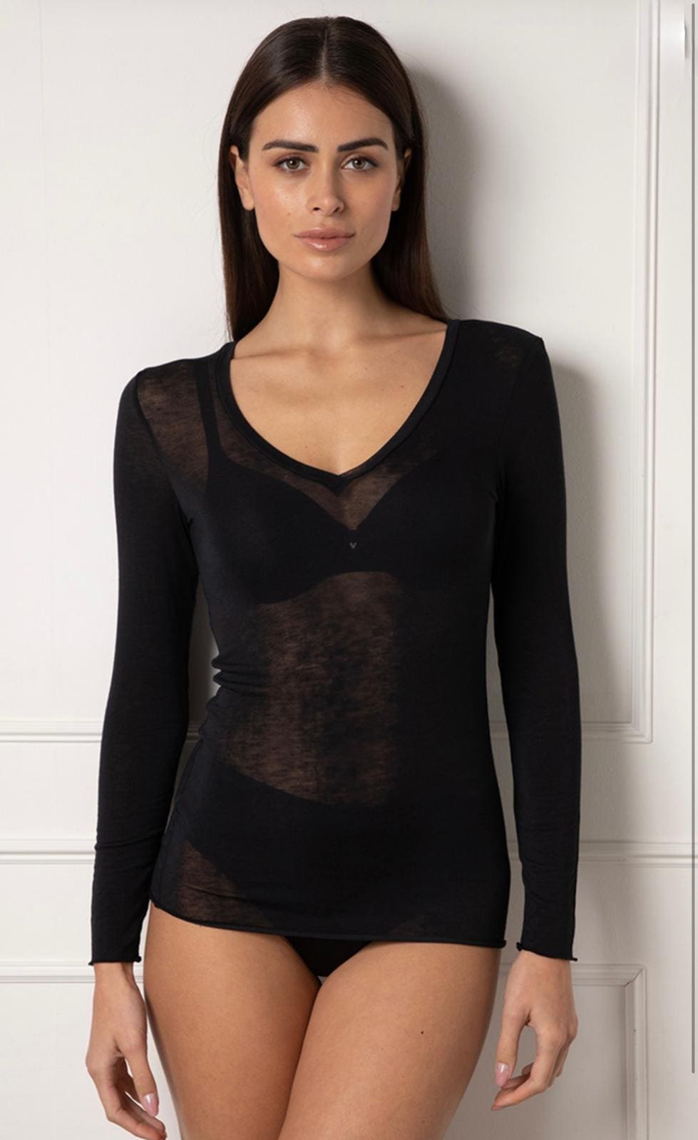 Il tessuto scivola sulla pelle con naturalezza, senza segnare né stringere, donando una sensazione di benessere che dura tutto il giorno. Il taglio classico con collo a V valorizza il décolleté e si presta sia ad essere portato da solo, sia come capo strategico da indossare sotto blazer, giacche o capispalla leggeri.