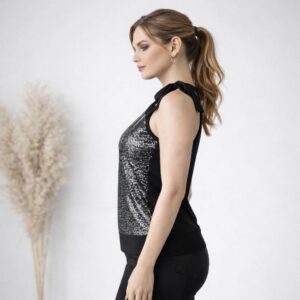 Il top nero con micro punti luce argento è realizzato in un tessuto fluido e leggero, impreziosito da riflessi delicati che catturano la luce in modo sofisticato.